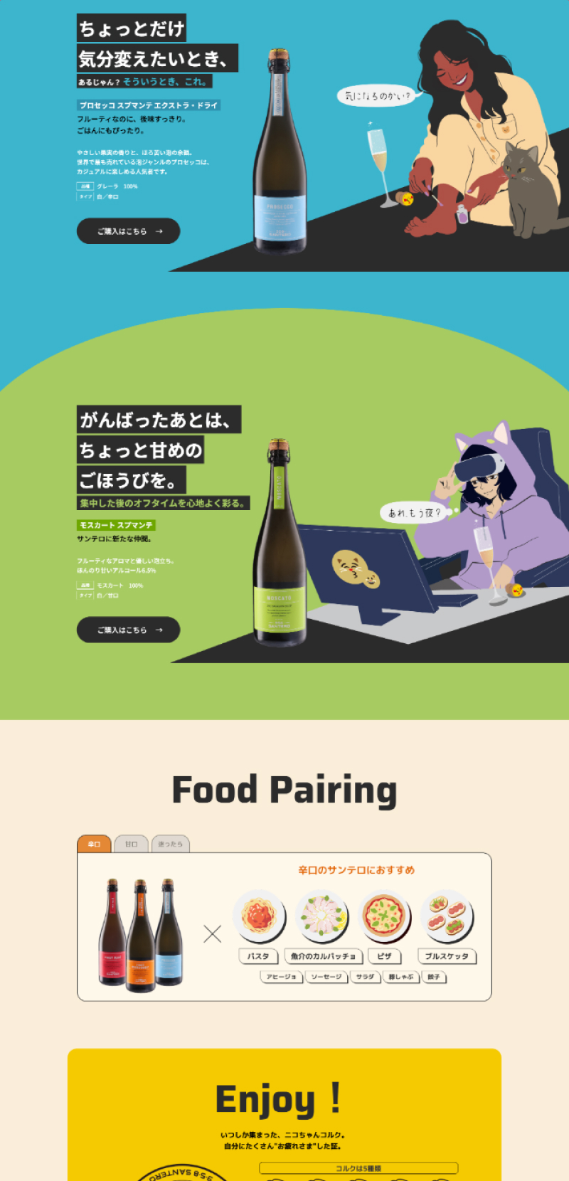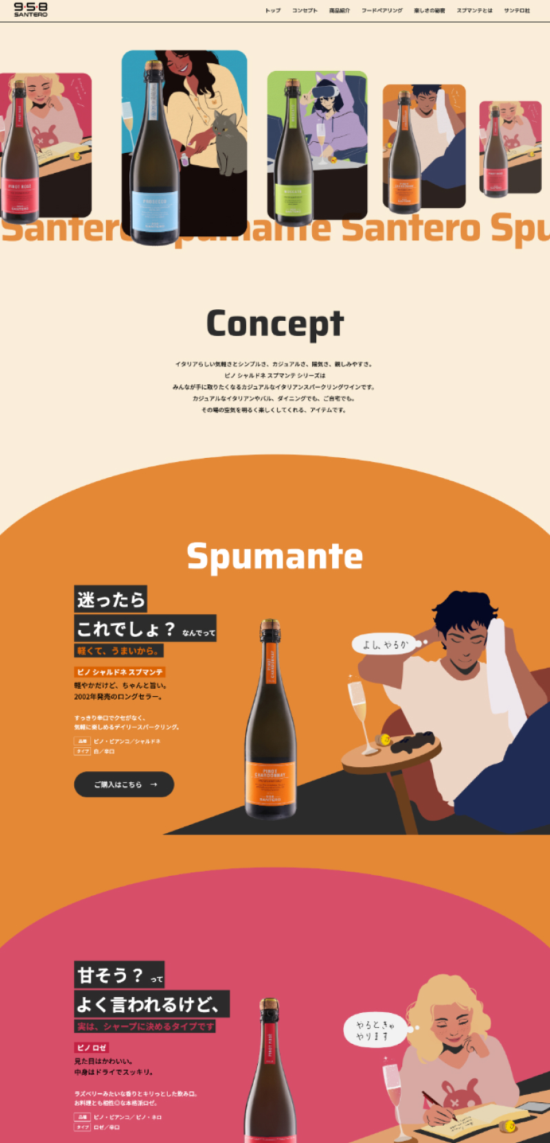 商品の愉快で楽しいイメージをカラフルな配色や大きめのフォントで表現しました。メインビジュアルのアニメーションはお客様からいただいたイメージを元に、JavaScriptを用いて形にしました。
